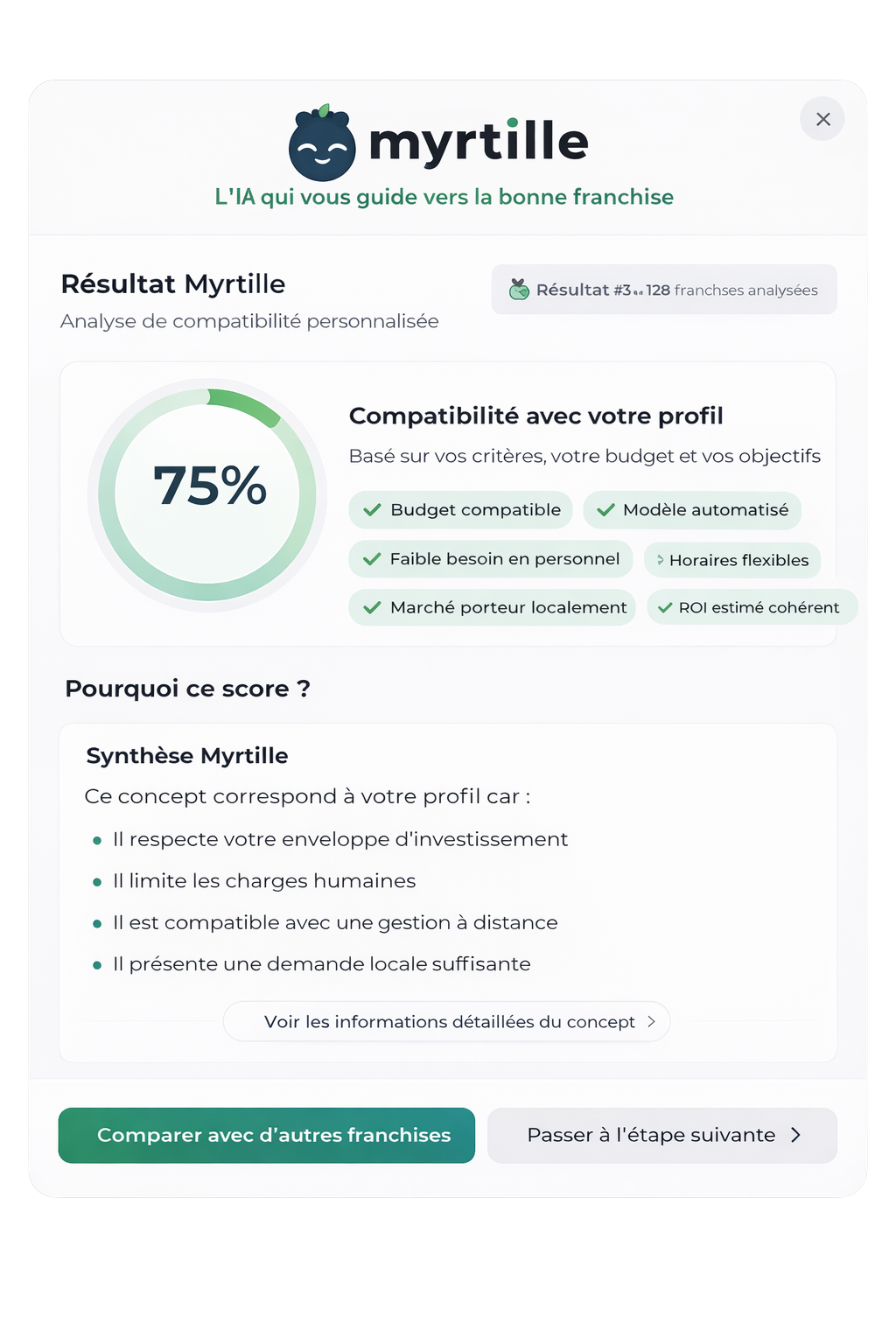 Chaque franchise recommandée est accompagnée des raisons précises de sa compatibilité avec votre profil.